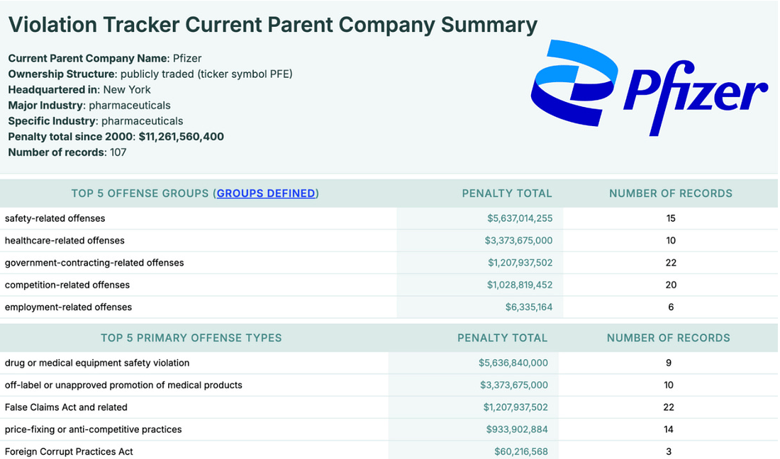 According to Violation Tracker, Pfizer’s penalties since 2000 total more than $11 billion across criminal, civil, and regulatory cases — a staggering figure that exposes a pattern of lawlessness, not isolated mistakes.