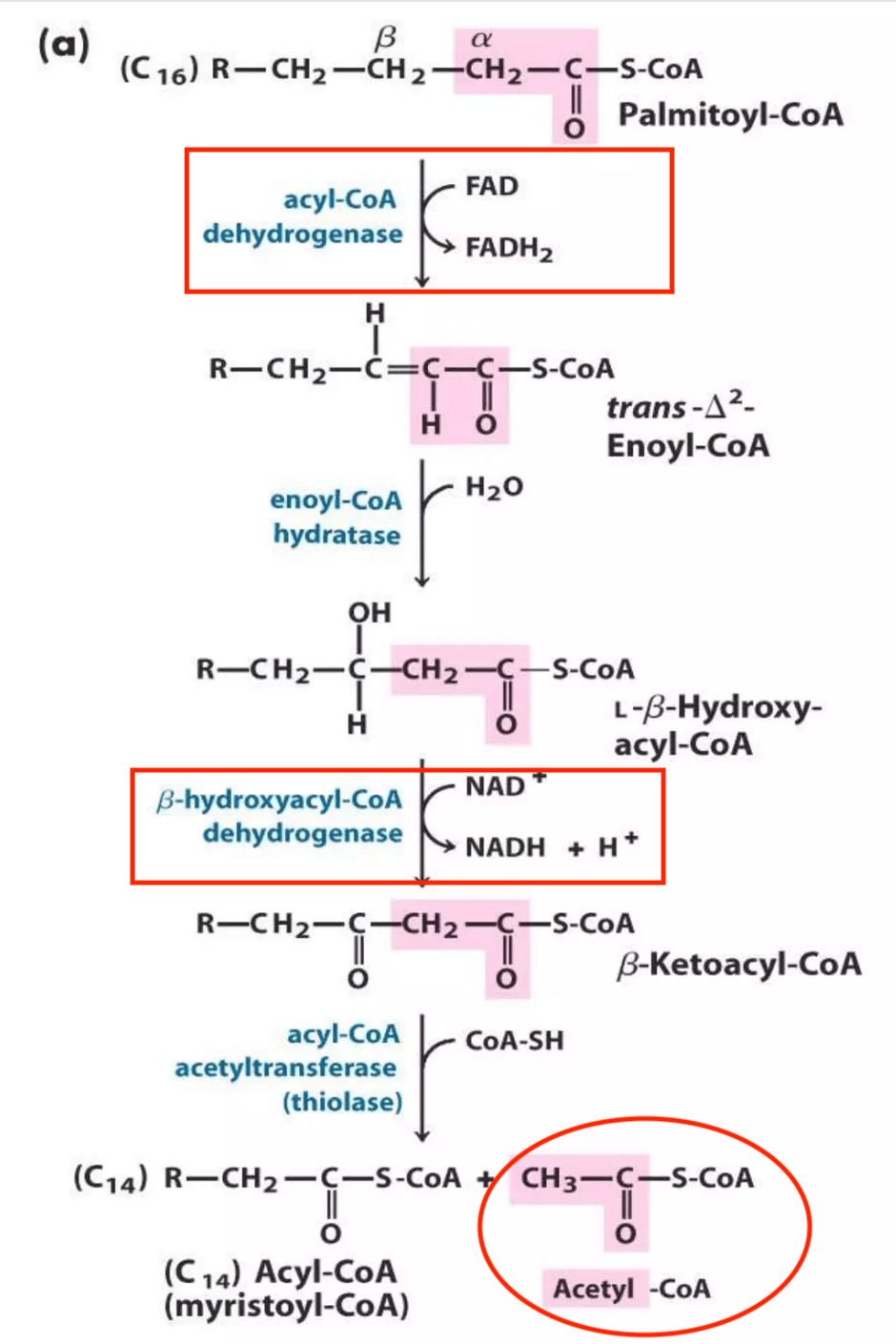In the first step shown in the graphic below, a 16-carbon saturated fat (palmitic acid) will have all its carbons chipped off two at a time to make acetyl CoA. In this case, the first two carbon atoms are in the pink color. The first step in the process is to add a double bond to the saturated fat (which has no double bonds in its native state), which you can see in the step below just to the left of the two carbons in pink.