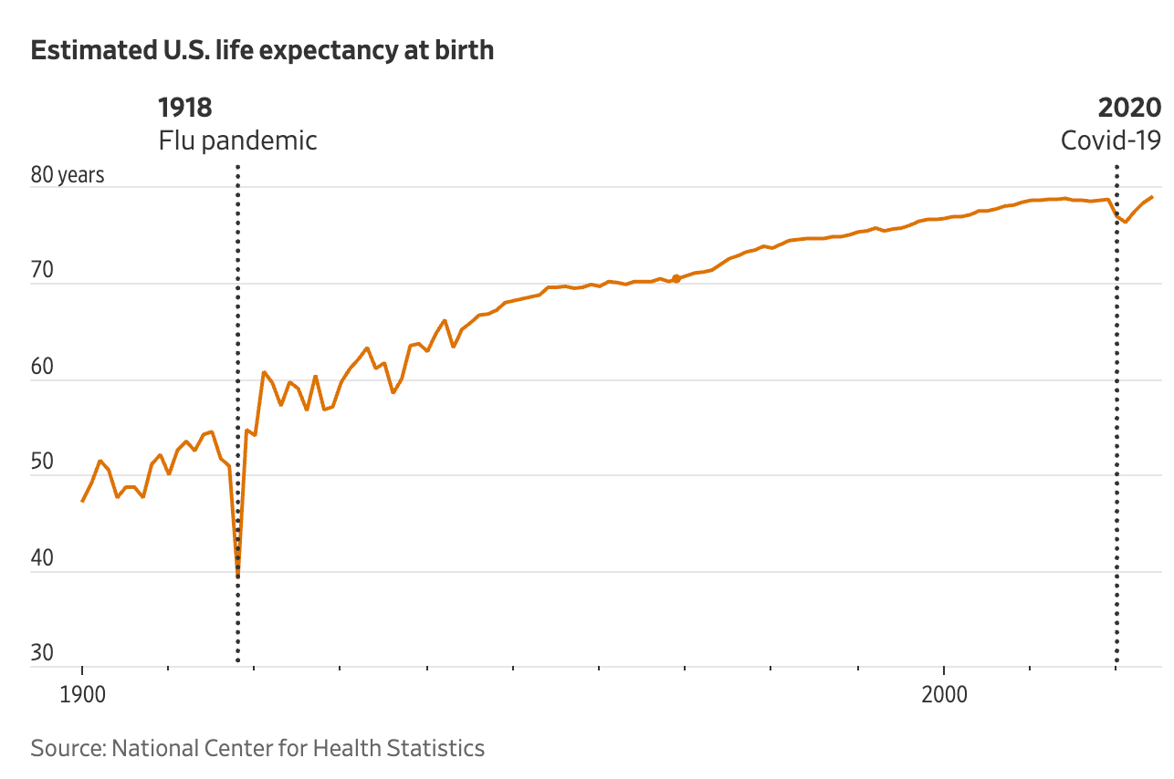 The article goes on to tell us that life expectancy for US citizens in 2024 rose to 79 years, the highest ever in American history. Life expectancy, an estimate of the average number of years a baby born in a given year might expect to live, given death rates at that time, rose slowly and steadily until about 2019, when it topped out near 79 years, but then declined sharply in the wake of Covid-19 deaths, which disproportionately felled the elderly.