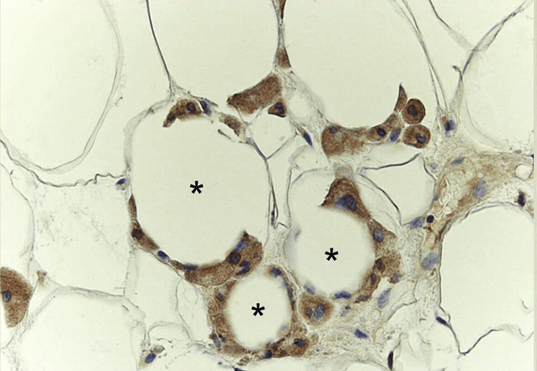 These macrophages accumulated in the visceral adipose tissue release resistin, a protein that activates a complex process that ends up increasing ApoB. As we discussed in an earlier newsletter, macrophages can make up half the mass of adipose tissue, which can produce a lot of resistin. See the graphic below showing macrophages in dark invading the adipose cells.